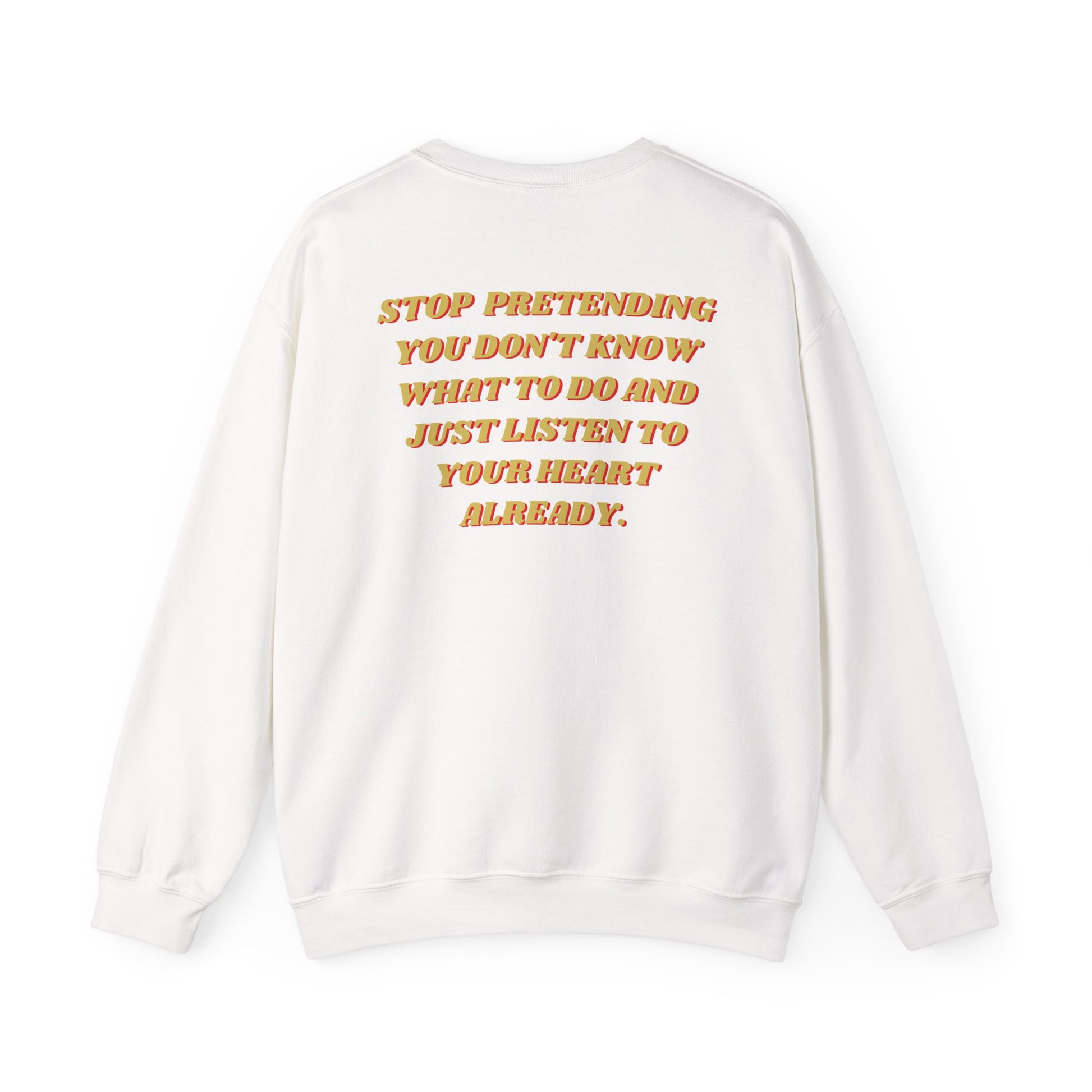 Back: "STOP PRETENDING YOU DON'T KNOW WHAT TO DO AND JUST LISTEN TO YOUR HEART ALREADY" in yellow/orange font